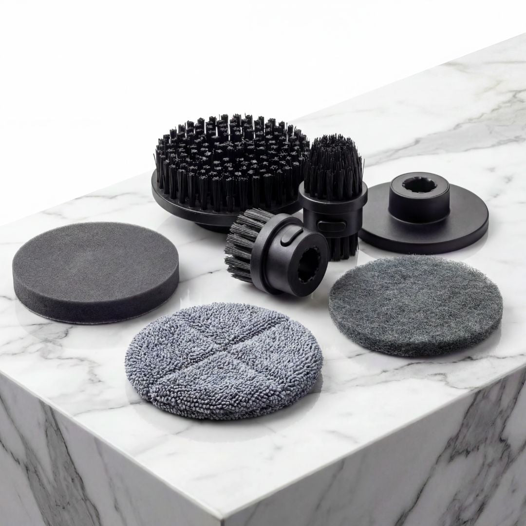 3 scrubbing brushes, thick, pointed, and medium.Scrubbing pad (Scotch-style), Microfiber Scrubbing Pad, and Foam Polishing Pad.